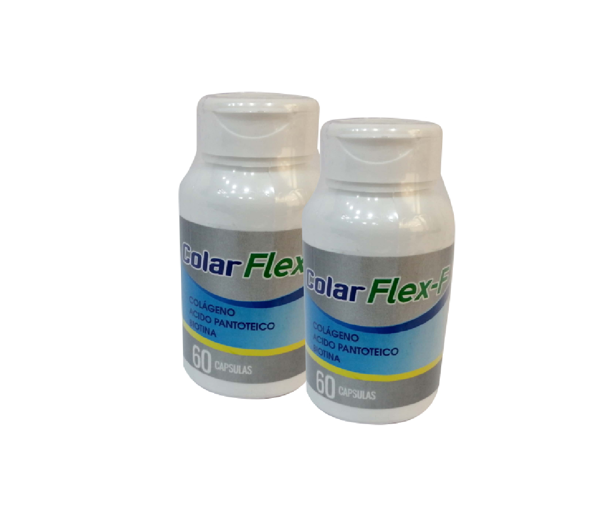 Colar Flex-F® es un suplemento formulado con colágeno, ácido pantoténico y biotina, diseñado para fortalecer y mantener la salud de la piel, cabello, uñas y articulaciones. Esta combinación de ingredientes contribuye a la regeneración de tejidos conectivos, mejora la elasticidad cutánea y promueve un aspecto saludable. Ideal para quienes buscan apoyo nutricional integral para su bienestar estético y articular, Colar Flex-F® se presenta en cápsulas prácticas para una administración diaria sencilla.
